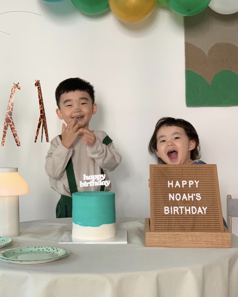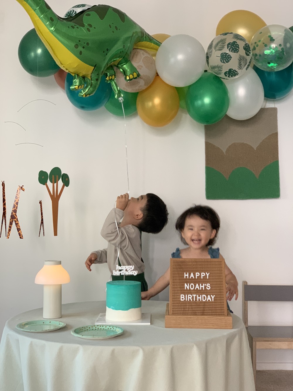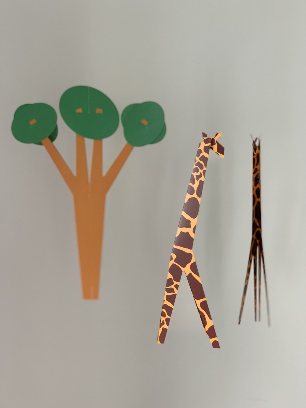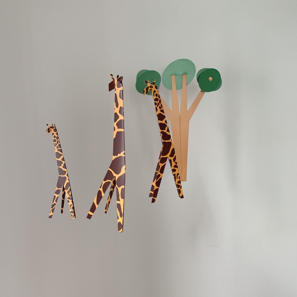 사바나 초원의 기린 가족들과 나무를 표현한 모빌입니다. 겹쳐진 나무 오브제에서 세심함이 느껴지며