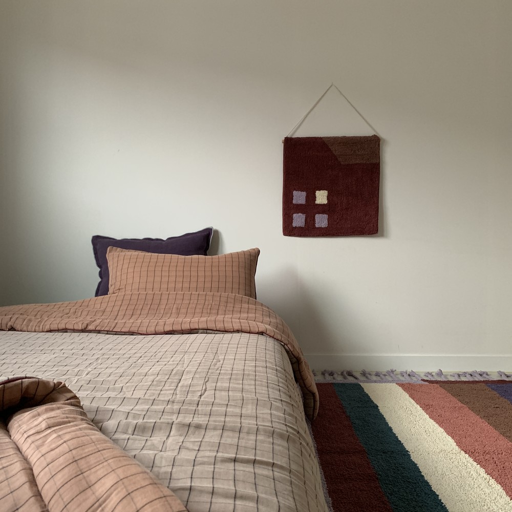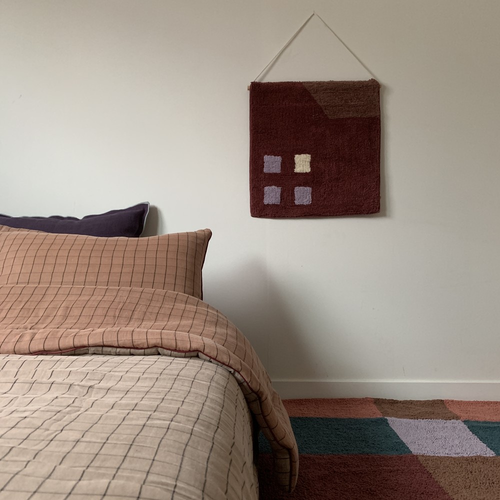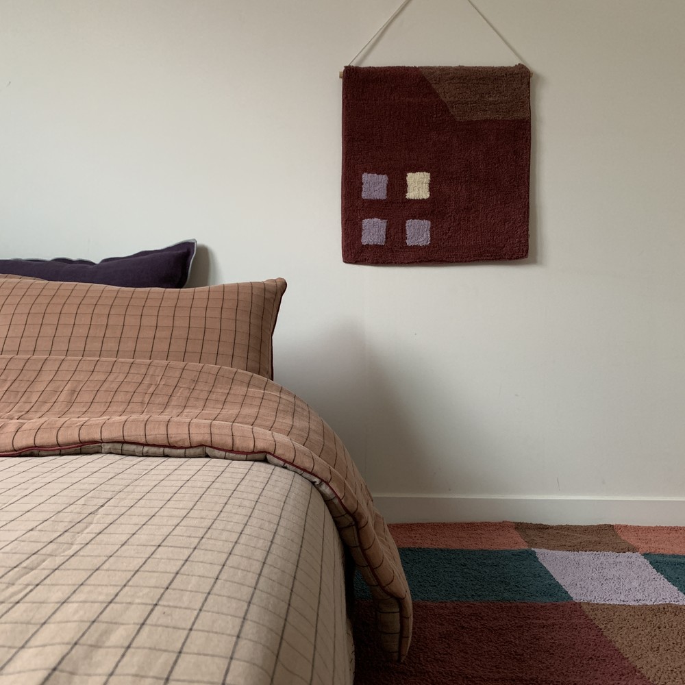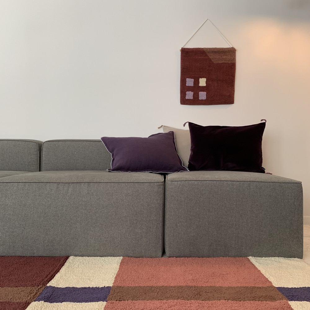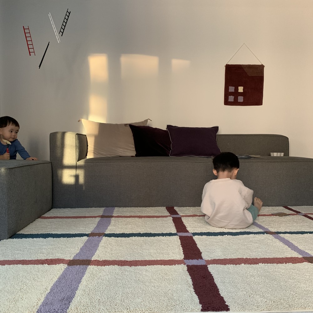 이번 스튜디오모티프 19FW 컬렉션의 컬러는 때론 진하고 깊게, 때론 생동감있는 컬러들이 함께 어우러졌기 때문에 더 재미있는 컬렉션이 완성된 것 같아요. 이번에 소개해드릴 월행잉은 깊고 진한 버건디 컬러의 바탕 사이로 작은 네모(Square)들을 생동감있게 나열해보았어요. 언뜻보면 창문같기도하고 또 어떻게 보면 위에서 바라볼 때 늘어져있는 아이들의 장난감 같기도한데 이 Four squares 월행잉이 또 다른 공간에서는 어떻게 쓰여질지, 어떤 의미가 될지 벌써부터 기대가 되네요.