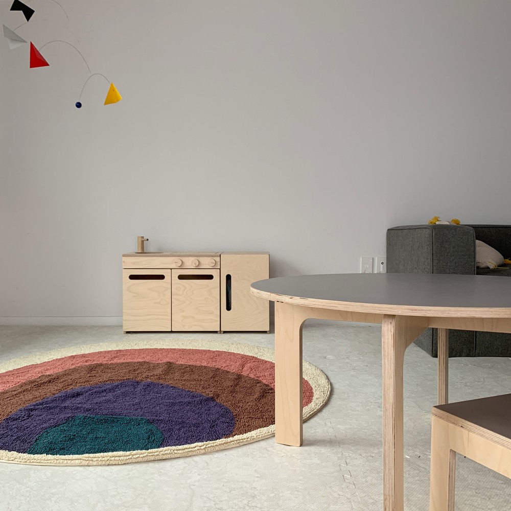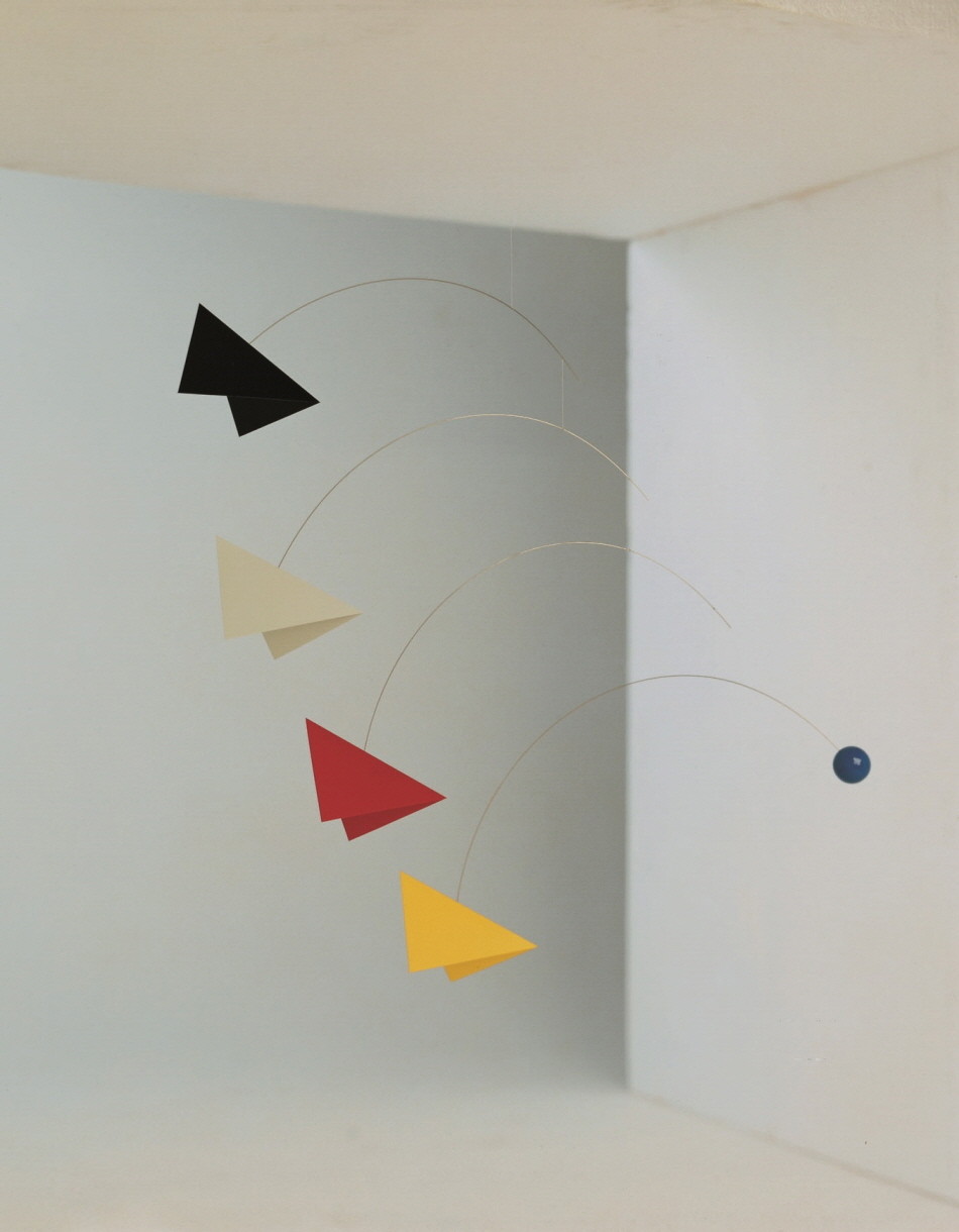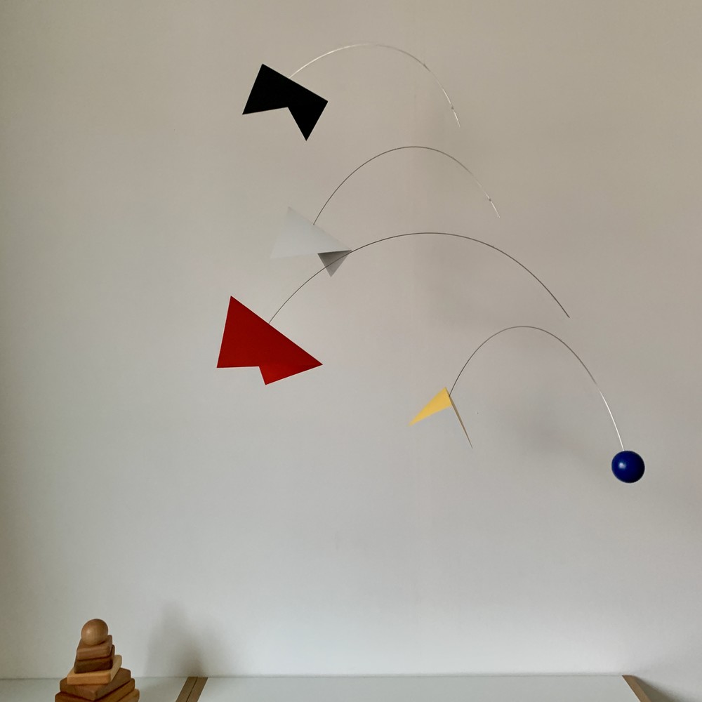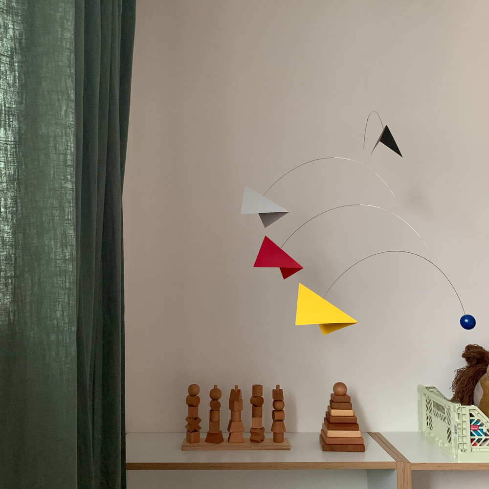 신기루를 모티브로 제작된 모빌입니다. 와이어의 곡선은 사막, 삼각 날개는 텐트가 연상되며 직선, 곡선, 삼각형, 원 등의 조화가