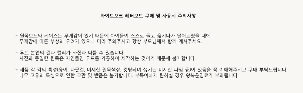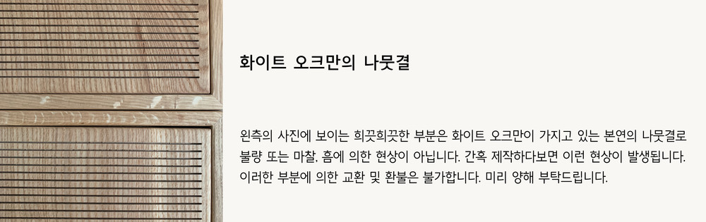 - 우드 제품의 경우 나뭇결, 옹이 등으로 인한 교환/반품은 어렵습니다. 우드가 컷팅되며 생기는 미세한 정도의 파임은 있을 수 있으니